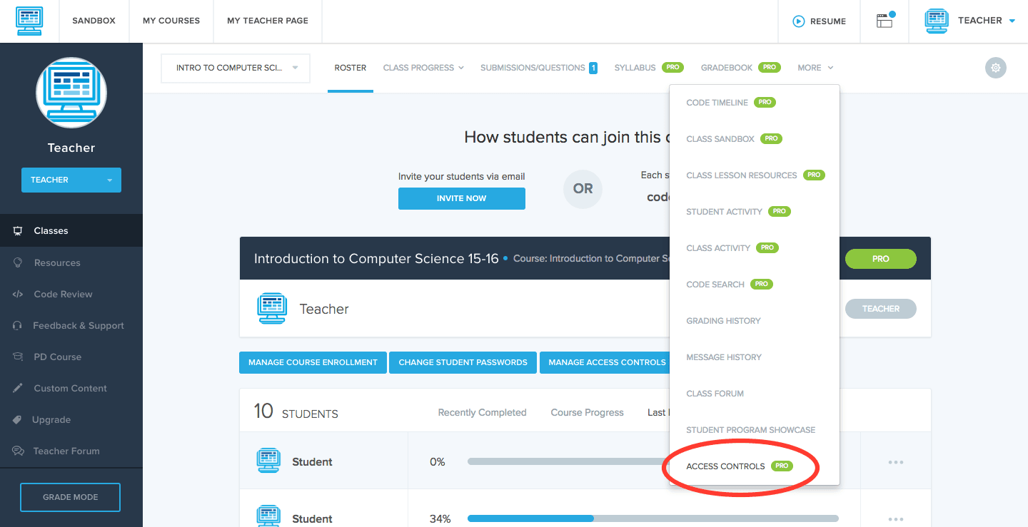 One of the most requested features is now available on CodeHS for teachers to use! This new tool is called Access Controls, and it lets teachers set the visibility of items, lessons, and modules, or even set the visibility for the future. Basically, you can now decide which sections of a course your students have access to and when. Access Controls is a powerful feature which allows you to set the pacing as you teach with CodeHS.