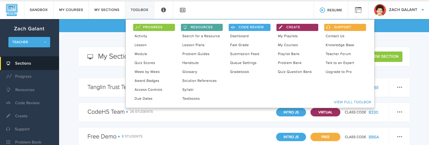 We created a Toolbox in the navigation bar which contains all of our teacher tools and resources. Teachers can quickly and easily access the gradebook, problem/quiz banks, handouts, lesson plans, progress tracking, and more.