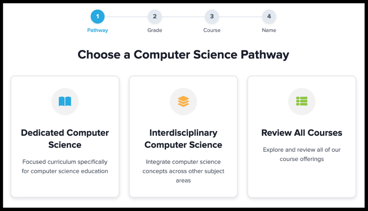 Select between the Dedicated CS or Interdisciplinary CS pathways—or explore all available course options. - Select your grade levels.