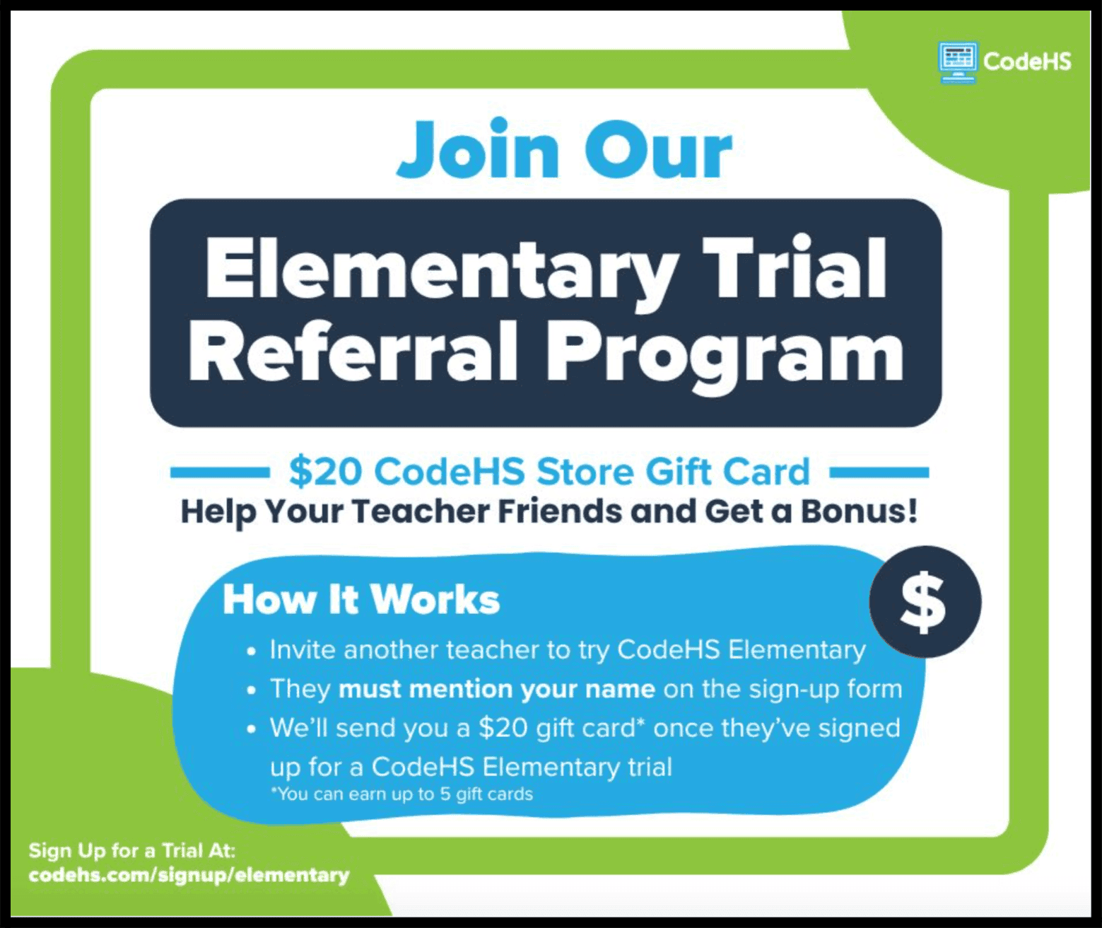 If you love CodeHS Elementary, we’d be thrilled if you shared this opportunity with your teacher network. As a thank you, you’ll receive a $20 CodeHS Store gift card for each teacher who signs up through your referral.